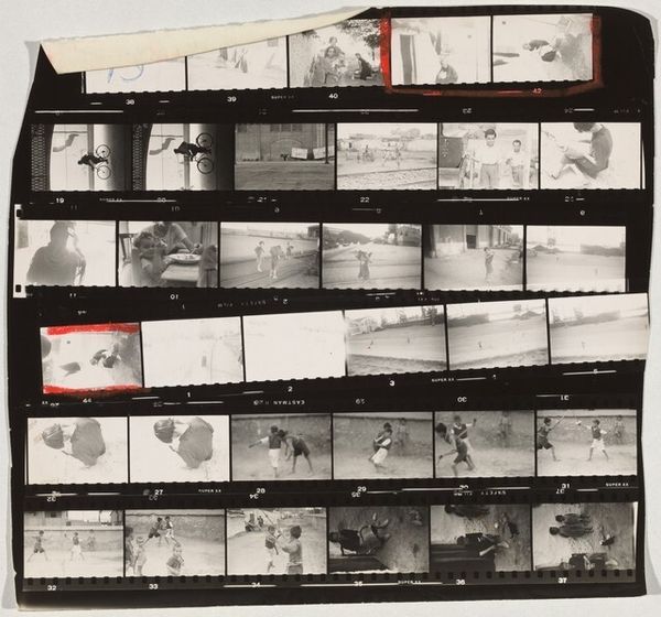 Editor: This is "Valencia, Spain 24," a 1952 gelatin-silver print by Robert Frank. It presents a contact sheet. The stark contrasts in black and white create a very documentary feel. There is no specific focus; it shows beach scenes, livestock on city streets and intimate scenes. What draws my attention, though, is that this contact sheet appears hand-edited. What are your thoughts on this particular layout? Curator: The hand-editing and overall presentation certainly inform our reading. The film strip as a whole becomes the subject rather than the individual images. Frank is deliberately exposing his process, inviting us to consider the choices made in selecting particular frames. Observe the marked frames with red outlines—these choices highlight a key decision-making process and how framing impacts meaning. Editor: That’s interesting. So, by revealing his working method, Frank emphasizes the constructed nature of the final photographic image? Curator: Precisely. The formal arrangement subverts the notion of photography as objective documentation. Note how the juxtaposition of disparate scenes--a group at the beach and the more intimate details in other frames—create a visual rhythm. The composition moves from public spectacle to private moment, enriching our reading of the overall narrative. Editor: It almost feels like a visual poem. What strikes me is the inclusion of mundane or ordinary settings with high art. I initially thought this might reflect some sort of street photography project of his, but I find myself unsure, looking at how curated his method is. Curator: Precisely. This selection creates meaning beyond the subject matter of each photograph alone. Frank’s presentation directs us toward thinking about his process and intention, it seems less about documenting reality and more about constructing a particular reading of Valencia. It showcases his photographic voice through selection and arrangement. Editor: I see now how this highlights the deliberate process of constructing a narrative through editing, a choice that has become a huge aspect of photography and filmmaking today. Curator: Indeed. And by explicitly showing these mechanics of representation, we realize that what the art represents is not the subject in each square but Robert Frank.