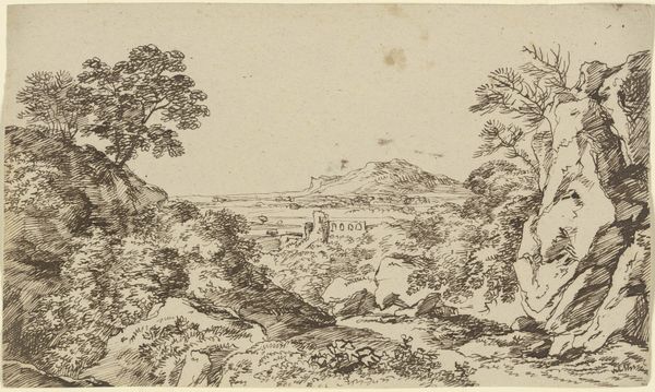 Curator: Take a look at this Renaissance drawing, "Mountainous Landscape with a Rock, Trees, and Buildings," created by Domenico Campagnola between 1517 and 1523. It's currently housed at the Metropolitan Museum of Art. What’s your initial read? Editor: There’s a striking stillness, a meditative quality. It's sepia-toned, of course, given the medium, and there's something almost dreamlike in the way the scene unfolds. I’m drawn to the massive rock dominating the foreground; it’s clearly important. Curator: It is interesting how Campagnola focuses on the foreground. This drawing exemplifies how artists in the Veneto region embraced landscape, imbuing nature with symbolic and emotional depth. Editor: Absolutely. The rock, specifically, feels primal, enduring. It has these deliberate lines etched on it. A foundation upon which everything else – the buildings, the distant mountains – is built, literally and metaphorically. Are the buildings a reference to a specific place? Curator: Probably not. Campagnola was more interested in creating an idealized vision of the landscape rather than an exact replica. There was a growing market for these autonomous landscape drawings as the status of landscape art rose. This would have been seen as its own self-contained work of art rather than a preparatory study. Editor: I see echoes of earlier symbolism; rocks can represent steadfastness or refuge. Also, I'm seeing almost classical elements. Are those building roofs evocative of ancient temples? Curator: That's an interesting thought, though there isn't clear consensus that Campagnola sought to embed any distinct visual cues that alluded to antique religious structures. Regardless, his Italian Renaissance context suggests that these echoes certainly cannot be ruled out. But in terms of cultural interpretation, what does the location do to the reading? It's displayed in the Met now, as a curated display from a major collection. Does that alter the reading compared to how it would have been viewed when Campagnola made it? Editor: The institutional framing invariably adds layers of meaning, but perhaps there's a core element that persists across centuries: the universal appeal of a landscape promising stability and something timeless. It's like an archetypal scene lodged deep in the collective consciousness, a vision that speaks to human harmony within the larger context of nature, even when the historical contexts shift. Curator: Precisely. I suppose Campagnola wouldn't be completely off if he knew his work would spark dialogue across the ages.