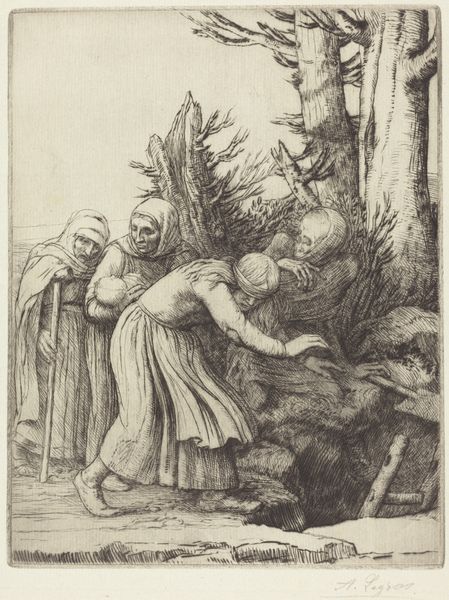Curator: So, here we have Sebald Beham's "The Entombment," an engraving from 1521. A rather somber depiction of Christ being laid in the tomb, wouldn’t you agree? Editor: Definitely somber! It's the heavy use of line for me; it feels almost claustrophobic, pressing down on the scene. A real sense of finality, like the closing of a chapter. Curator: Line work was definitely Beham’s strength. It creates a real intensity. It’s part of a larger historical tradition too, of course. The Entombment is a common subject throughout Christian art—symbolizing grief, remembrance, but also anticipation of resurrection. What strikes me is the intimacy within the drama. Editor: Yes, it's surprisingly tender given the drama of the event. Look how they’re handling the body so gently. You feel a sense of shared sorrow. Are those vine roots at the top of the arch significant? Curator: The roots! Excellent observation. Symbolically, in this context, they might represent lineage or the connection between heaven and earth, a subtle suggestion of Christ's divine nature even in death. Consider how powerfully the use of the arch focuses all attention on Christ, becoming almost a womb-like opening. It pulls the viewers in. Editor: It works like a visual echo! So many Renaissance artists were thinking along the same symbolic lines – rebirth being suggested right there in the visual structure! Beham seems to really be distilling grief into pure form through the composition and line. It's moving. Curator: Indeed. Beham was working in the Northern Renaissance, where printmaking flourished as a means to disseminate ideas. This image, though small, carries significant emotional weight, shaped by a specific moment in cultural and religious history. Editor: Makes you think about how symbols endure, doesn't it? This image speaks volumes about loss and love, and here we are, centuries later, still feeling it. Beautiful, haunting stuff. Curator: Absolutely. It speaks to the enduring power of visual language to convey profound truths about the human condition across time and space. Editor: Well put. Let's move on; I think I need something a little lighter now.