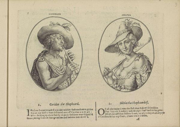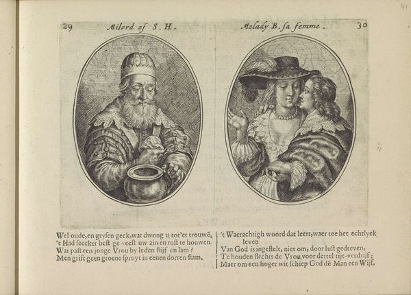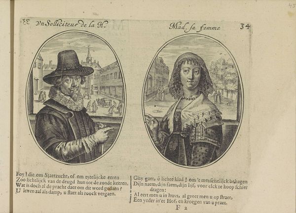 Editor: This engraving, "Lakei en wasvrouw," made by Crispijn van de (II) Passe in 1641, pairs a liveried Black man with a washerwoman, each framed in their own oval. It’s stark – the contrasts, the lettering underneath… What can we interpret from these two portraits placed side-by-side? Curator: Well, viewed through a historical lens, these pairings often served a didactic purpose. These prints, especially when accompanied by text as here, aimed to convey a moral message reflecting societal values of the time. Notice how the figures are titled, and how verses sit underneath them. Editor: Right. What kind of values are being expressed? Curator: Consider the social standing of each figure. The “Lakei,” or lackey, a servant, and the washerwoman are positioned in relation to perceived virtues or vices. Are these idealized images, or are they critiques? Editor: I see the writing below...were these verses commenting on morality? Could they be criticizing the social order rather than upholding it? Curator: Precisely! The role of prints in disseminating social commentary during the Baroque era is vital. Who was the audience for these prints, and how did their context influence the reception of such images? Prints were more accessible than paintings. Consider also that these were sometimes bound into books or circulated as individual sheets. The way they were viewed shaped the message they conveyed. Editor: So, it is like a window into the attitudes and societal values around class and maybe race from that period. Curator: Yes, and questioning those attitudes is key. We move beyond mere description, to actively understanding the political intent in representations of diverse people and classes, and this affects what the art "means". Editor: It gives a completely new perspective! Thanks!