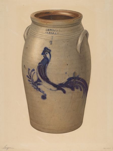 Editor: This watercolor, "Crock," painted around 1939 by Yolande Delasser, captures a humble earthenware crock. There's a quiet, almost nostalgic quality to it. What strikes me is how she elevates such a mundane object. What's your interpretation? Curator: It's fascinating how Delasser isolates this utilitarian object. In the context of the 1930s, this representation transcends mere still life. Consider the Dust Bowl era; simple, durable goods took on new significance. Do you see how this "Crock" symbolizes resilience, self-sufficiency? The folk art-inspired cobalt decoration too hints at this era. Editor: I do see that now. It is as if this piece speaks to simpler times, and the dignity of labour during a time of crisis. The colours she used are so subdued. Curator: Exactly! And think about the socio-economic implications: ceramics, as a medium, historically links art to the everyday, to the working class. Displaying it in a museum, transforming it into art, challenges traditional hierarchies. Did Delasser choose her subject consciously, knowing she would later contribute this simple "crock" for us to observe? Editor: Perhaps. So its accessibility also plays a role in its message, removing barriers of comprehension for art audiences that weren’t familiar with abstract themes? Curator: Precisely. By rendering it with the finesse typically reserved for 'high art', Delasser democratizes both the object and artistic expression, placing it within everyone’s reach. Editor: That gives me a completely different view of the piece. Thank you for elaborating! Curator: And thank you. Looking closely at everyday objects can often be an intriguing window to understand art as cultural history.