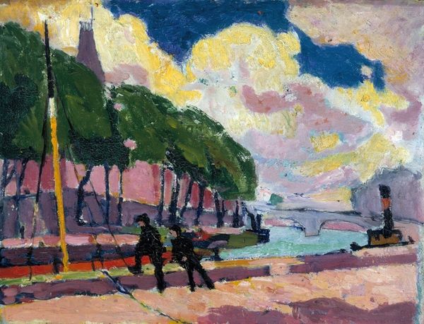 Editor: Here we have Kandinsky's "Park of St. Cloud," painted in 1906. The oil paint is applied so thickly, almost sculpted onto the canvas! I'm immediately struck by the contrast between the darker trees and that bright, sunlit path. What jumps out at you? Curator: Precisely. Note how Kandinsky abandons strict representation in favour of gestural marks and vibrant color. The materiality of the paint itself becomes the subject. The visible brushstrokes articulate form, light, and the artist’s subjective experience. Consider how the composition invites the viewer into the park. Are we participants, observers, or both? Editor: I hadn’t thought of the paint itself as the subject, but you're right. It's less about depicting a park realistically, and more about the *feeling* of being in that space through colour and texture. Is the lack of precise form typical of Kandinsky at this stage? Curator: Indeed. "Park of St. Cloud" prefigures his later abstract explorations. Observe the dynamic tension between representation and abstraction; trees and paths are discernible, yet dissolve into fields of pure colour. The artist is seeking the spiritual in the material, the emotive power of colour, the structured chaos that gives energy. Editor: It's interesting how he balances the recognisable elements with these almost abstract bursts of color. It's a lot more considered than it initially seemed! Curator: Consider also the spatial relationships constructed through color. Darker colors are weighted in a certain relation to lighter colors to allow our viewing eye to bounce back from the vanishing point, suggesting movement. Do you note that as well? Editor: Absolutely! I do now. This has really deepened my appreciation for Kandinsky’s early work and helped me consider his formal techniques. Curator: Excellent. Looking closer at structure helps us understand this painting as more than just a picture, but as an experiment with form, colour, and composition, with emotion being the most profound.