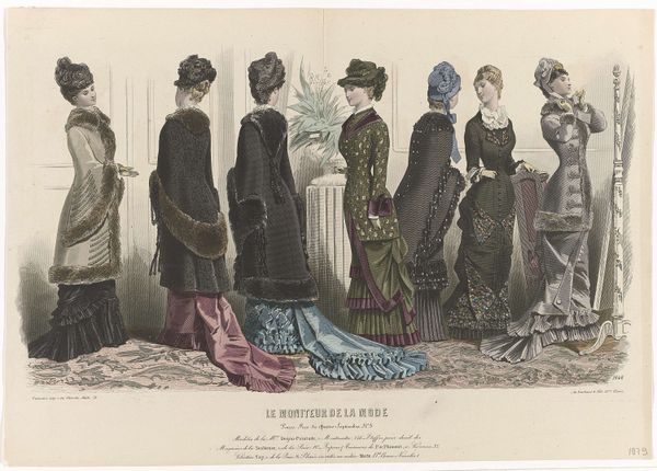 This fashion plate was published in Paris in 1887, offering a snapshot of late-19th-century style. It’s made through printmaking, a process that allows for mass production and wide distribution. The material of the print itself, paper, is relatively inexpensive, in contrast to the luxurious textiles and elaborate embellishments depicted. Think of all the labor involved in creating these garments: the spinning of thread, weaving of fabric, cutting, sewing, embroidery, and trimming. Each dress represents countless hours of work. The print acts as a promotional tool, fueling consumer desire and demand for fashionable goods. It highlights the relationship between art, commerce, and the burgeoning fashion industry, which employed countless workers at all levels of society. By focusing on the material and processes represented here, we realize that this image is not just a pretty picture, but a window into the economic and social realities of its time.