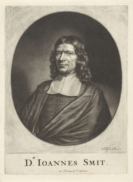Curator: Look at the density of line! This engraving, "Portret van Willem Hattum", crafted in 1695 by Anthony van Zijlvelt, it's amazing to see the minute detailing brought to life with such sharp contrasts. Editor: Yes, it certainly presents a stately presence. The stark black and white, the enclosed oval framing... it gives the impression of a very controlled, deliberate image. A mood of reserved authority emanates from the piece, don’t you think? Curator: Undoubtedly! What strikes me immediately is the socioeconomic implications of this medium. Engraving was often commissioned—it was a process that signified investment and permanence, suggesting a certain societal standing of the subject. A marker of material culture. Editor: From a formal perspective, the portrait is quite intriguing. Observe the use of line weight to define form, particularly around the subject’s face and the intricate lace detail of his collar. Van Zijlvelt manages to capture texture through the crosshatching and varied mark-making techniques which were signatures of Baroque prints at this time. Curator: And think of the role Hattum himself would have played, the commissioning patron. Understanding the modes of Baroque prints at the end of the 17th century reveals a connection of knowledge networks and financial ability between sitter and printmaker. This image exists because of a transaction, a desire for representation and remembrance. Editor: Representation it certainly achieves. The play of light and shadow, so effectively rendered, almost seems to sculpt Hattum's features. We're guided around his face and garments, even by the lettering on the bottom placard that forms part of the overall aesthetic balance. It almost evokes a silent narrative. Curator: Absolutely, and I am drawn into how these images helped disseminate not just images but notions of social hierarchies. Editor: A collaboration of skilled labor, the distribution of printed portraits undoubtedly played an integral role in shaping Baroque society’s understanding of notability. A compelling work viewed through varied critical lenses. Curator: Exactly. Each level highlights a different aspect. I think this offers a glimpse of a complex relationship, a reflection of Dutch society viewed via class and skilled craft.