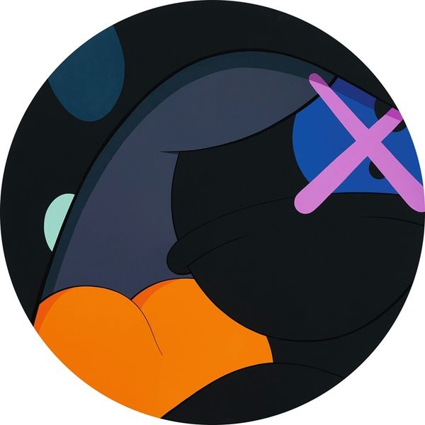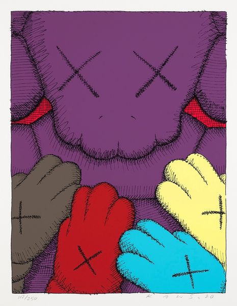 Editor: So, this is KAWS' "What Party #2" from 2020. It looks like an image of one of KAWS's signature figures in blue against a bright orange background, and it's pretty impactful because of the bold colors and flattened perspective. What's your take on it? Curator: I see this work as a potent commentary on consumer culture and its impact on identity. The use of cartoon-like figures, almost childlike, is reminiscent of pop art’s appropriation of mass media imagery, but here the dialogue shifts towards exploring themes of alienation and commodification within contemporary society. Editor: Alienation? The bright colours make it seem quite cheerful, almost celebratory. Curator: The ‘X’ eyes, which recur throughout KAWS's work, speak to a kind of removal, an absence, almost a blindness perhaps brought about by this oversaturation. What does it mean when corporations can hijack one's attention? Considering the historical context of the late 20th and early 21st century and rise of the internet, is this ‘blindness’ an active and voluntary rejection of traditional values? Editor: So, are you saying the work's not just fun, but it’s really asking us to question all the things that seek our attention? Curator: Exactly! This tension between playful aesthetics and deeper, unsettling themes, really encapsulates a pervasive sense of modern anomie that filters into everyday life. Editor: It definitely gives me a lot more to consider. Thanks. Curator: The pleasure is all mine. Hopefully now it’s a little easier to resist the more banal solicitations of the digital age.