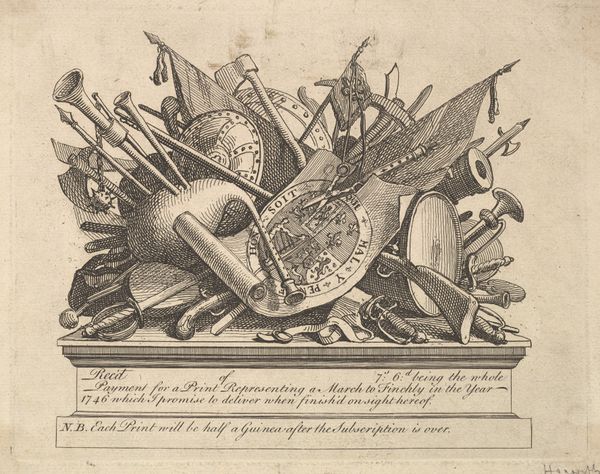 William Hogarth made this engraving, "Stand of arms and instruments," in England to serve as a subscription ticket. His appeal to the public served the same purpose as the modern gallery system. The image creates meaning through Hogarth's visual codes and cultural references to symbols of state. The inclusion of instruments and arms alludes to the Jacobite rising, an event that threatened the monarchy and prompted a patriotic response. Hogarth's focus on this theme situates the artwork within the political tensions of its time. Looking at the institutions that shaped Hogarth's career, we can see how he challenged the artistic norms and aristocratic patronage of his time. His subscription model democratized art. Historians can use diverse resources, such as social and political documents, to better understand the artistic production of the time. Art's meaning is always influenced by its social and institutional context.