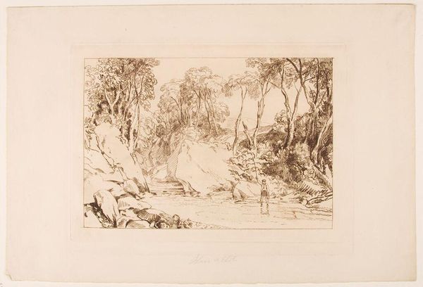 Curator: There’s a certain stillness that emanates from this print. It feels both inviting and remote. Editor: Indeed. This is "Near Blair Athol, Scotland," by William Say. Say, who lived from 1768 to 1834, captured a serene Scottish landscape. The solitary fisherman immediately catches the eye. Curator: He does. He seems to be enacting a timeless ritual, almost as if a symbol of man’s connection to nature. Editor: I see it more as a reflection of land use and leisure in the early 19th century. Fishing wasn’t just sustenance; it became a marker of social status and a form of recreation. Curator: Perhaps. But the muted tones evoke a sense of memory, a romanticized vision of the Scottish Highlands. Editor: An idyllic portrayal, definitely. It's interesting how Say used the aquatint to create these gradations of light and shadow, shaping our experience. Curator: It certainly invites introspection. Editor: It does make you consider how landscape imagery was utilized to reflect certain values.