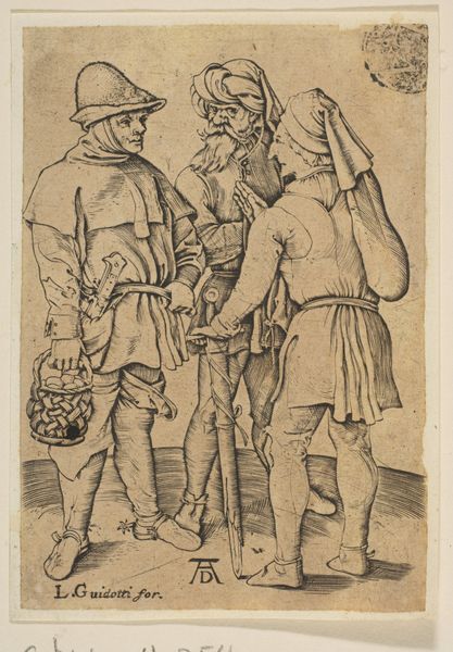 Martin Schongauer made this engraving, *Kreuzigung des Heiligen Andreas*, from around 1480, using a metal plate, likely copper, and a tool called a burin. The image emerges from the precise, controlled cuts made into the metal. Look closely, and you’ll see how Schongauer used hatching and cross-hatching to create tone and volume, a testament to his mastery of the engraving technique. The lines are not just descriptive, they define the emotional impact, intensifying the drama of Saint Andrew’s crucifixion. Engraving was a painstaking, labor-intensive process, requiring both technical skill and artistic vision, with the engraver working as both designer and maker. This print, and others like it, existed in relation to the rise of a print market, which provided devotional images for an expanding audience, and it offered artists like Schongauer a way to disseminate their designs widely. Considering the intricate work involved and its social context, this print challenges our assumptions about the hierarchy of art, raising the status of craft to the level of fine art.