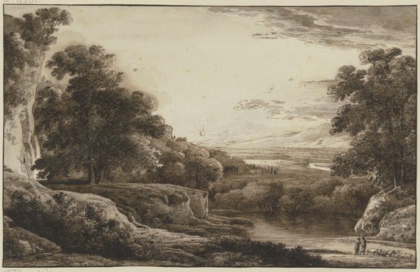 Editor: This is "Flusslandschaft, rechts steiler Felsen," or "River Landscape, Steep Rocks on the Right," a drawing by Franz Kobell. It's primarily ink and watercolor, rendered in a beautiful, muted sepia tone. What strikes me most is how the artist balanced the ruggedness of the landscape with the delicate rendering of light and shadow. What do you see in this piece? Curator: The strength of this work resides in the clear dichotomy between its planar organization and tonal unity. Observe how Kobell contrasts the solid forms in the foreground--the rocks, the bold tree on the left—with the misty atmosphere and more diminutive, vaguely rendered forms in the background. How does this tension function? Editor: It makes the scene feel vast, almost infinite, yet grounded at the same time. It feels both real and dreamlike. The detailed foreground pulls you in, while the hazy background suggests endless possibilities beyond what’s immediately visible. Curator: Precisely. Consider the composition. Note the deliberate placement of the large tree acting as a framing device and counterweight to the cliff face. It guides the eye. Notice also how the light falls--not uniformly, but in focused patches that call attention to specific areas. Do you find a symbolic relation within the aesthetic framework of Romanticism, given the medium itself? Editor: I do. It feels as if Kobell is not only representing a scene, but also expressing an emotional response to it. Perhaps, a reflection of humanity’s relationship with nature? Curator: The sepia palette softens the forms. We may see a study of the formal qualities--texture and scale, space and the tension therein--more clearly. Editor: That's a fascinating perspective, focusing on those fundamental contrasts. I never considered how the color palette serves such a role, revealing an order and balance. Curator: Indeed, this work reminds us that the power of art often lies not in its representational accuracy, but in the arrangement of its basic elements.