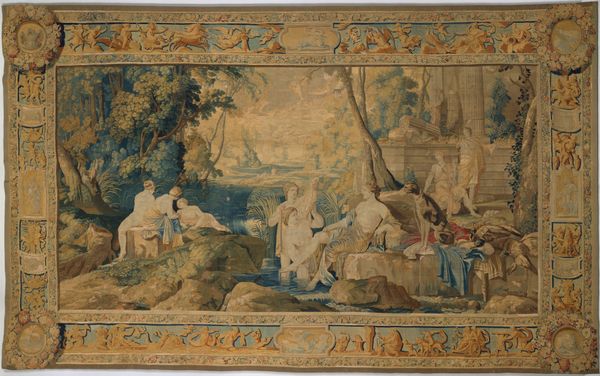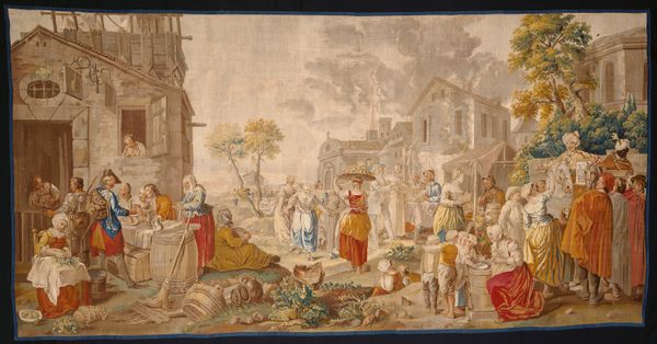 Editor: This is "The Repast from the Set of Russian Entertainments", created sometime between 1767 and 1772. It appears to be mixed media, with oils and watercolors playing a significant role. The overall atmosphere seems quite lavish, portraying a group of people engaged in leisure within an ornate landscape. How do you interpret this work? Curator: Immediately, I see a clear demonstration of power and privilege through this elaborate display of leisure. Considering the context of late 18th-century Russia, such scenes often functioned as carefully constructed propaganda. What appears as mere "entertainment" might obscure the realities of serfdom and immense social inequalities. What details do you think the artist is intentionally highlighting here, and what might be conveniently omitted? Editor: I see the fine clothing, the musicians, and what seems to be a bountiful table of food. These details, presented almost theatrically, point to a life of abundance. The presence of boats further emphasizes a sense of movement and access to resources. Is there any tension or critique embedded in the composition that challenges this superficial read? Curator: Precisely. Tapestries like these weren't simply decorative; they projected an image. I wonder about the "Russian Entertainments" title and what that means for those actually providing this "entertainment." Think about who had access to art and these portrayals of leisurely life. Whose stories are deemed worthy to be immortalized in artistic expressions such as this, and more importantly, whose stories are systemically erased from view? Editor: That's a powerful point. Viewing the artwork as an intentional act of portraying an unbalanced class structure makes a huge difference. Curator: Yes, questioning these lavish displays lets us peel back layers of meaning, recognizing both the overt narrative and the obscured realities that lie beneath. Ultimately, artworks such as "The Repast" ask us to consider how cultural productions participate in social discourse. What lasting impression does that leave you with? Editor: It highlights how crucial it is to view historical artworks with a critical eye, constantly asking who is included, who is excluded, and whose narrative prevails. Thanks!