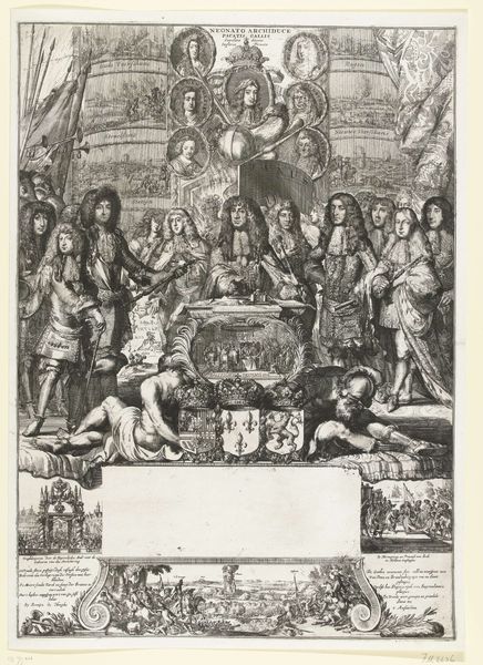 Pieter Tanjé created this print, "Ferdinand VI as successor to Philip V in the midst of his family," without a specified date. It presents a formal depiction of succession, laden with symbols of power and lineage. The most striking motif is the crown, presented as both a symbol of authority and a physical object of inheritance. Crowns appear above portraits of rulers and are carried by cherubic figures. This symbol resonates across centuries, from ancient Roman laurel wreaths signifying triumph, to medieval coronations, each iteration embedding notions of divine right and inherited power. These symbols tap into deep-seated psychological desires for order and stability, using the visual language of power to reassure viewers of continuity. This iconography, however, is not static. The scepter, the heraldic shields, even the clothing, each element carries its own history, evolving and adapting to new cultural contexts, reminding us that power itself is a performance, constantly renegotiated and represented.