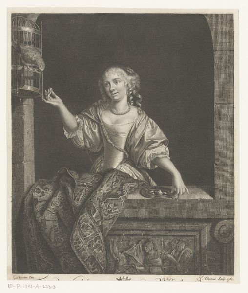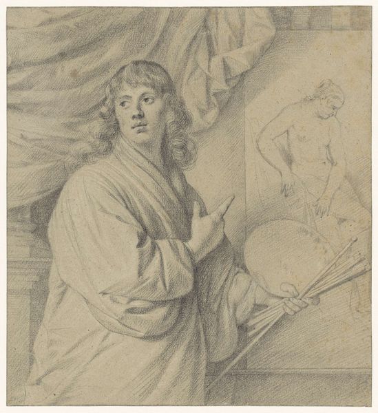 This is a drawing in graphite by Jan Verkolje I, portraying Hugo van der Helst in what appears to be a garden. Graphite, at the time, was a relatively new medium, not yet fully understood, but deeply connected to social issues. The material offered artists the ability to make detailed drawings that mimicked engravings, which were becoming increasingly popular at the time. Graphite pencils allowed for mass production of images, connecting art with emerging capitalism. Here, Verkolje has used graphite to capture the soft textures of fabric, the flowing hair, and the depth of the garden setting. Graphite’s capacity for shading and fine detail allowed Verkolje to give this portrait a sense of depth and realism, almost like a photograph before its time. Paying attention to the materials used, and the methods of making, can help us understand how art is a reflection of its time, intertwined with the socio-economic currents of its production.