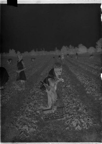 Editor: This silver gelatin print by Martin Schweig depicts eight children and a baby in a stroller. I’m struck by the contrast between the dark background and the light figures. What visual elements stand out to you? Curator: I am drawn to the formal arrangement of the figures. Note how the repetition of striped shirts and the linear connection of their clasped hands create a strong horizontal rhythm. This contrasts with the verticality of the central tree trunk. How does this interplay affect the composition? Editor: It creates a balanced tension. The tree grounds the children, while their linked arms imply movement and potential energy. Curator: Precisely. This tension, achieved through form and structure, is what lends the photograph its visual interest, wouldn’t you agree? Editor: Definitely. Now I see how the relationship between those elements creates such a dynamic composition.