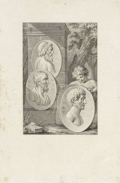 Reinier Vinkeles created this detailed print, "Medaillons met portretten van Aratos van Sikyon en Marcus Brutus," using etching techniques. Its composition is a structured arrangement of classical motifs. The portraits, presented as medallions, are set against a backdrop featuring architectural ruins and lush foliage. Vinkeles uses fine, intricate lines to define forms, creating a textural richness that invites close inspection. The strategic placement of light and shadow gives depth to the scene, highlighting the contours of the medallions and the textures of the surrounding elements. This print invites us to consider how classical forms and the detailed textures of the natural world can create a dialogue. The artist's formal decisions in structuring the composition reflect broader intellectual currents of his time. The work establishes a connection between the past and present, inviting viewers to reflect on enduring legacies and interpret the relationships between different historical and cultural moments.