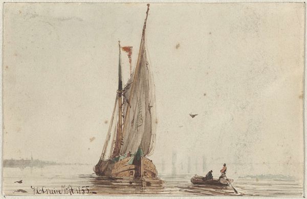 Editor: Johan Christian Dahl’s "Two Sailing-Boats at the Elbe," painted in 1827, seems like a small, fleeting moment captured in oil. I’m struck by the tranquility of the scene; the soft light and muted colors create a very peaceful mood. What symbols or meanings do you see woven into this seemingly simple landscape? Curator: The scene certainly evokes tranquility, but I think there is more at play when we consider the historical context and the symbols employed. The boats themselves, still and at rest, might represent a pause in life's journey. Notice the single figure standing on the larger boat; what could that isolated presence suggest to you? Editor: Perhaps a sense of individuality or self-reliance? Maybe even contemplation? Curator: Precisely. That figure becomes a conduit. Through that presence, Dahl taps into the Romantic fascination with the individual's relationship to nature and the sublime. This isn't just a picture of boats; it is a meditation on humanity's place within the larger world, made clear with light and subtle figures. Do you notice how light creates visual depth, symbolic weight? Editor: I see what you mean! The darker boat seems more grounded, literally and figuratively, compared to the lighter, smaller one. The boats act as opposing visual ideas. It’s much more complex than I initially perceived. Curator: Exactly. The interplay of dark and light, stillness and potential movement, anchors these boats as powerful symbols within the wider landscape of Romanticism. What have you learned about symbolism? Editor: The conversation made clear how even simple subjects can reveal a range of emotional and philosophical symbols. I have renewed curiosity and hope. Curator: Art opens that space. The world has visual cues all around for you to interpret and reflect.