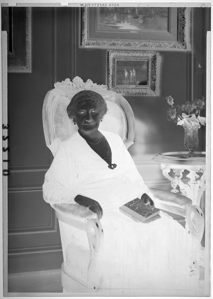 Editor: Here we have an untitled photograph by John Howell of a woman holding a book in front of a fireplace, found at the Harvard Art Museums. It's rather striking, almost ghostly in its high contrast. What's your take on it? Curator: The photographic inversion process draws our attention, doesn't it? How might this negative image function within a social context? Perhaps it challenges traditional portraiture, questioning who gets to be seen, and how they are represented. What does the setting suggest to you? Editor: It feels staged, almost performative, especially with the book as a prop. Does the fireplace point to status or domesticity? Curator: Precisely! It could indicate both. Think about the politics of respectability and how imagery can reinforce or subvert power structures. Did this change your perception of the piece? Editor: Definitely. I see it now as less about the individual and more about the image itself, and what it projects.