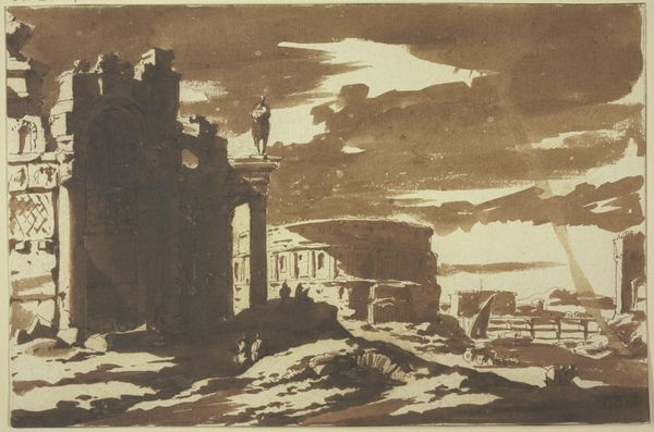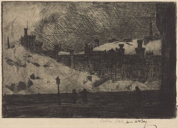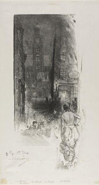 Curator: Let’s take a look at Theodore Wahl's "Sixth Avenue," rendered with graphite, pen, and ink— a compelling cityscape, don’t you think? Editor: My first thought is cold. Not just visually, but emotionally. There’s a real sense of loneliness humming in this depiction of a city. The grey, the starkness... feels like a silent film. Curator: Indeed, and in its monochrome austerity, the piece echoes anxieties of modern urban life. The city, particularly post-industrial centers, were often sites of displacement and alienation, anxieties represented by the stark composition. The blurred lines could speak to the precarious nature of existence under such systems. Editor: That blurring is doing so much. Is that snow or just…city grime? Maybe it’s both. To me, that's life: beautiful moments layered with daily grit. There’s a bunch of figures scuttling about, heads down, but not really interacting. Curator: That disconnection is vital. Artists during the modernist era frequently portrayed crowds as homogenous entities, stripped of individual identities and autonomy by overwhelming structures, political as much as architectural. The looming buildings, like silent sentinels, dwarf any notion of individuality and freedom. It's social commentary through aesthetics, I'd suggest. Editor: Absolutely. What’s also really powerful is what’s not shown. Where’s the vitality? The vibrancy you associate with urban life? What narratives is Wahl suppressing with his visual choices? It feels really heavy on purpose, don't you agree? Curator: Precisely. By intentionally excluding elements typically associated with urban allure, the artist spotlights societal fractures, implicitly critiquing social orders that promise inclusivity but deliver estrangement. Think about Walter Benjamin’s writing on the flâneur, this aimless stroller observing urban alienation; that lens really shapes how we understand works from this era. Editor: The tallest building dominates and appears dark with almost a sense of impending doom, like a foreboding castle wall in this so-called modern landscape, just weighing on everyone, isn't it? Well, this piece is going to hang around in my mind for a while. I really felt that desolation. Curator: For me too. It encourages an examination of the forces constructing not just cities, but social realities that continue to influence and confine us, provoking necessary introspection.