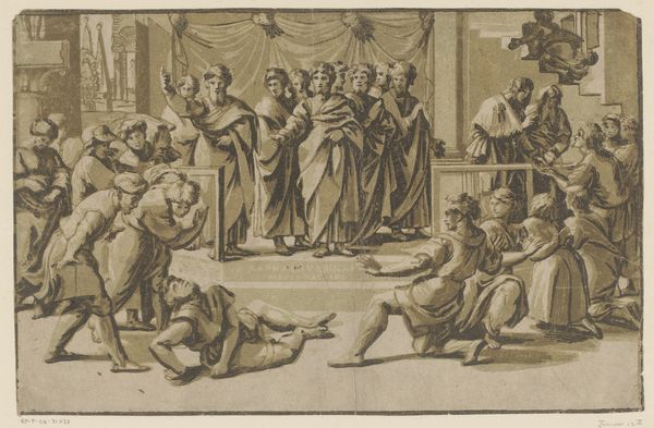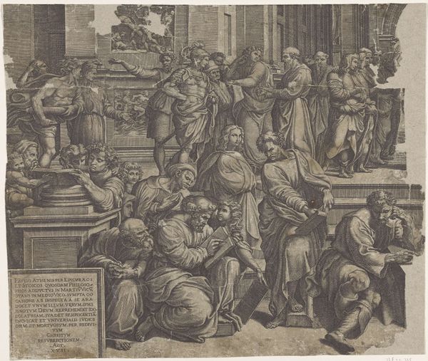 Giovanni Jacopo Caraglio made this print, The Martyrdom of Saint Paul and the Condemnation of Saint Peter, using engraving. Notice how the composition is structured around classical architecture, which serves as a stage for the dramatic events unfolding. The stark contrast of light and shadow, achieved through dense, meticulous lines, heightens the emotional intensity. The figures are rendered with pronounced musculature and expressive gestures, typical of Renaissance art. The print visualizes power dynamics. The seated ruler and the executioner represent the state authority, while the saints, depicted in moments of intense suffering, embody spiritual resistance. The symmetry of the architecture versus the chaotic arrangement of figures creates tension, reflecting the struggle between law and faith. Caraglio's use of line and form not only conveys a biblical narrative but also engages with broader Renaissance ideas of justice, sacrifice, and the individual's relationship to authority. The work invites us to consider how visual structures reflect and challenge dominant ideologies.