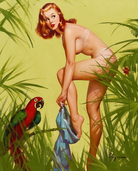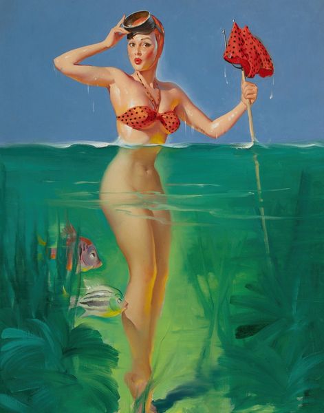 Curator: Here we have Mort Künstler’s, The Captured and the Captivated, from 1965. The painting presents us with quite a narrative tableau. What's your initial read? Editor: The limited palette immediately strikes me. The near monochrome lends it an unsettling, dreamlike quality. And what's with the dynamism inherent to the composition of forms, especially between the woman in the foreground, the GI sitting in the tree, and that wild looking Tarzan figure ripping the canvas? Curator: That “wild” figure you mention raises several questions about its context and underlying meaning. The painting clearly references both pulp adventure and perhaps even the tropes found within male fantasies. Who holds power, and who is subject to it, seems central to how we view the artist’s representation of masculinity, femininity and primitivism in the painting. Editor: True, but there is that foreground figure pulling on her bathing suit as a deliberate aesthetic act to the composition itself; the gesture directs the eye deeper into the space. This kind of self-aware contrivance of line and form cannot be overlooked, in terms of how we are intended to relate to these different forms of male-female tension and relations between civilization and primitivism. Curator: Certainly, the visual relationship you describe can easily become something akin to spectacle that can risk falling back onto the representation of stereotypes of a White Western male's gaze on a woman or on so-called primitive men that reinscribes those oppressive power dynamics onto an objectified Other. This kind of Orientalism is present in visual culture from its historic roots into today’s media. Editor: Yes, but isn't that reading itself reliant on a certain narrative pre-determination that misses out on the sheer pictorial complexity here? Consider how our perspective shifts constantly. It's not merely a subjugation but also an invitation, almost as though all the characters want to say or ask us something? Curator: An invitation yes, perhaps into a larger questioning of the West's relationship to itself, to its perceived others, and to those historical tensions still impacting present-day structures of oppression, patriarchy, and racism that this imagery activates even further. Editor: Okay, so to return to my opening comment then; what if the dream we seem to witness and be caught up in represents not domination but a more complex interplay of aesthetic gestures, which also function, let us agree, as symbols of conflict and attraction, or if you like domination, within a limited register of chromatic affect, spatial relation, and iconographic potential? Curator: I concede your emphasis on pictorial gesture provides insight. I remain troubled by how easily a critical approach could turn towards validating or repeating forms of othering. Food for thought, I think. Editor: And the piece itself performs the same function on both its own context and our experience.