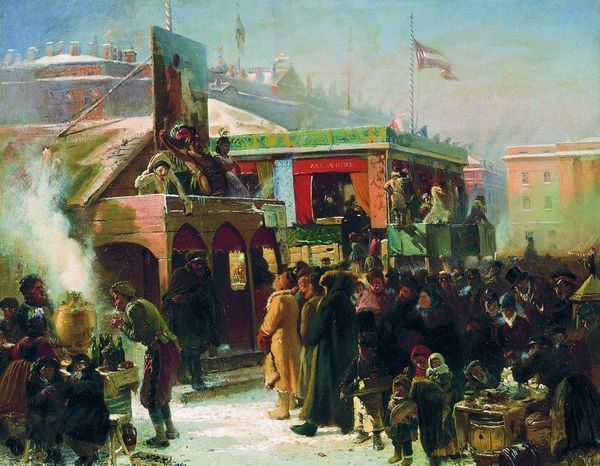 Konstantin Egorovich Makovsky captured this lively fair in St. Petersburg with oil on canvas. The central symbol is the bustling crowd itself, a motif resonant with historical and cultural energy. The imagery of the masses evokes Dionysian revelry, hinting at primal gatherings that stretch back to antiquity. Consider the bacchanals depicted in ancient Roman frescoes or the crowded market scenes of Renaissance paintings; Makovsky’s fair shares a kinship with these historical depictions of communal activity. This collective effervescence, the surging energy of the crowd, taps into our collective memory, echoing moments when social order blurs and individual identities merge into the collective. The emotional intensity of this gathering, with its blend of anticipation and chaos, engages our subconscious on a deep level. This cyclical dance of social energy reappears throughout history, evolving through new cultural contexts, yet carrying the echoes of ancient rituals.