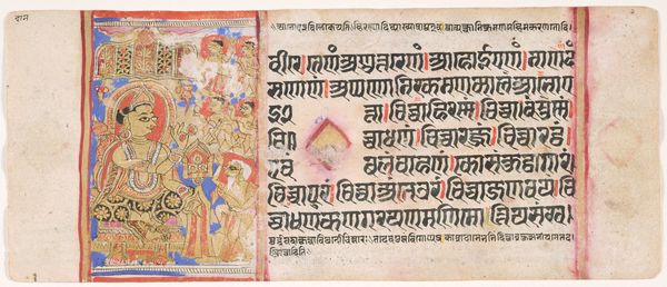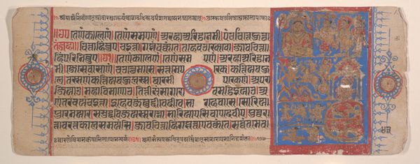 Curator: Alright, let's discuss this striking artwork titled "Kalaha Preaches to King Sahr - Mahavira’s Departure with Indra - Adoration of a Tirthankara," dating back to around 1500. It’s currently housed in the Minneapolis Institute of Art and executed with ink, watercolor and coloured pencil on paper. The piece seems to illustrate three narrative sections and the choice to use such vibrant colors creates a world of its own. What are your initial thoughts? Editor: It's the narrative aspect that grabs me most, especially as these miniature paintings often acted as visual anchors for religious texts. How was this piece likely used and what public role might it have played? Curator: That's a crucial point to consider. Manuscript illustrations like this served multiple roles within their socio-cultural context. They weren't merely decorative; they were pedagogical tools, aids for storytelling and vehicles for conveying religious ideologies to a largely non-literate audience. Who was commissioning them and viewing these works also shapes meaning. Knowing the audience affects our understanding. Were they meant for courtly circles or religious orders? Editor: I imagine access would have been limited, perhaps influencing its power all the more. Did these illustrations also legitimize the patron or the religious figures depicted? Curator: Precisely. Art is never neutral. The act of commissioning art, the selection of subject matter, the artistic style itself—all served to reinforce existing power structures or subtly challenge them. This piece subtly promotes Jain ideals by showing important narrative scenes in such refined style. Looking at how these visual narratives intertwine with the textual elements tells us much about art’s persuasive role within its cultural moment. It becomes more than aesthetic. What did you learn from the context that the artwork exists within? Editor: I realize now how easy it is to admire art purely for its beauty while missing the socio-political dialogues it engages in. Viewing this miniature, through a historical lens gives it new depth.