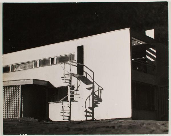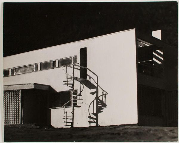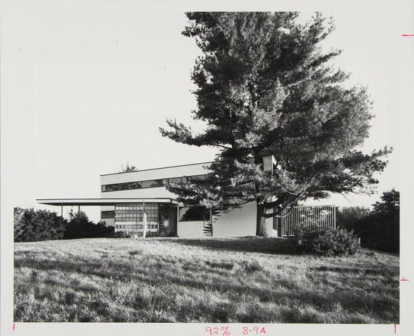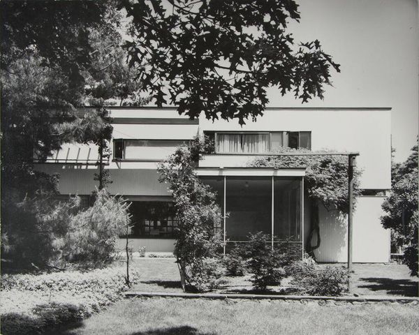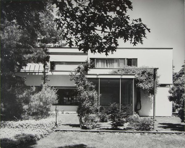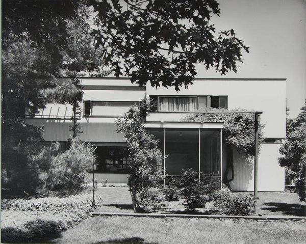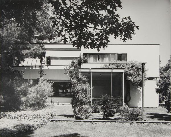 Curator: This is Paul Davis’s photograph, "Gropius Residence, Lincoln, Massachusetts, 1938," now part of the Harvard Art Museums collection. Editor: It strikes me as a rather austere portrait, all clean lines and right angles. It feels very self-contained, almost as if the building is deliberately turning away from the landscape. Curator: The house, designed by Walter Gropius, was meant to be a beacon of modernism, a symbol of progress and rational design. The flat roof, the ribbon windows—it’s all about breaking with tradition. Editor: And the columns? They seem almost like stylized trees, a nod to nature, but nature tamed and ordered. There’s a tension here, between the organic and the geometric. Are we meant to see it as a modern Parthenon, a temple to a new age? Curator: Perhaps. Gropius aimed for simplicity, functionality. Maybe he saw it as a bridge between the old world and the new, a harmonious blend of nature and technology. Editor: Or maybe it's just a very stylish box, yearning for a bit of ivy to soften the edges. I find myself wanting to see it in color, to feel the light. Curator: That's the thing about photographs; they freeze a moment in time, inviting us to fill in the gaps.