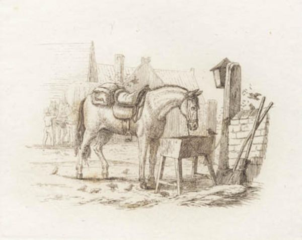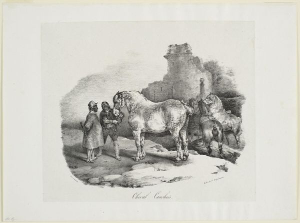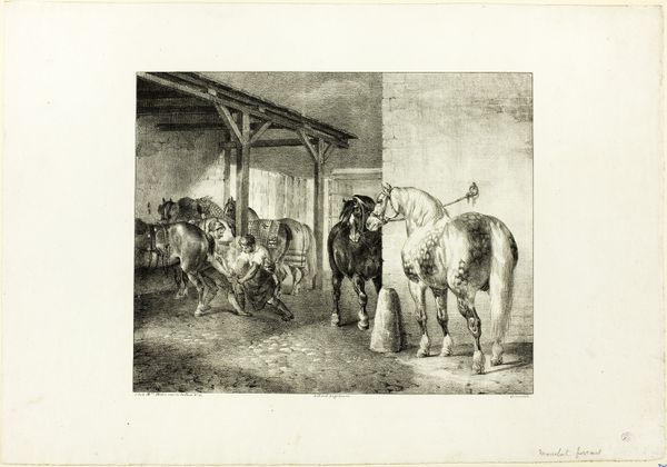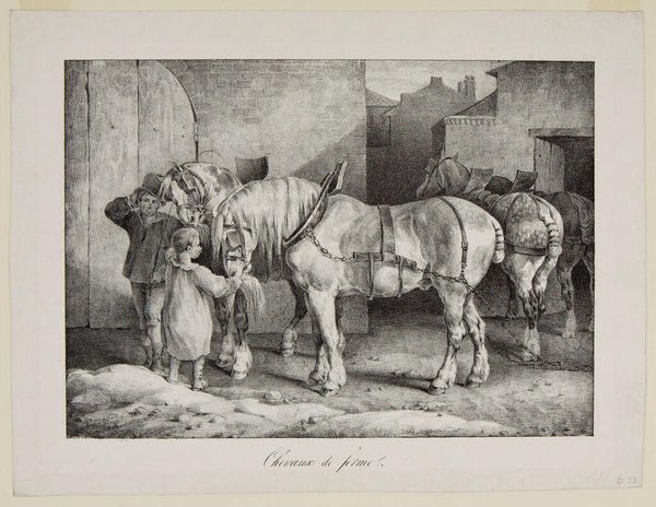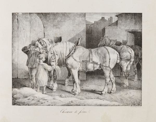 Curator: This is Théodore Géricault's "Farm Horses," housed here at the Harvard Art Museums. Editor: It's like stepping into a dream—all greys and muted tones, full of gentle giants. There's a quiet strength here. Curator: Géricault's imagery often taps into the power and, indeed, the plight of animals, reflecting a romantic sensibility and an evolving social consciousness. The horse, of course, is a potent symbol. Editor: Absolutely. Look at the way the child interacts with the horse's mane. It's an innocent touch, a connection to something powerful yet harnessed. The horses are clearly vital, but also bound. Curator: Precisely. The harnessing speaks to labor, duty, the animal's role within society. There's a tension between freedom and constraint that resonates. Editor: I feel a slight melancholy, though. They seem so burdened, and the setting, while rural, feels a bit confining. Curator: Géricault masterfully captures that feeling. He gives us beauty, but also a sense of the world's weight. Editor: It makes you think, doesn't it? About our relationship to the natural world, the burdens we place on others. Curator: Indeed, Géricault leaves us much to ponder. Editor: A quiet masterpiece.