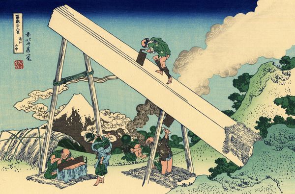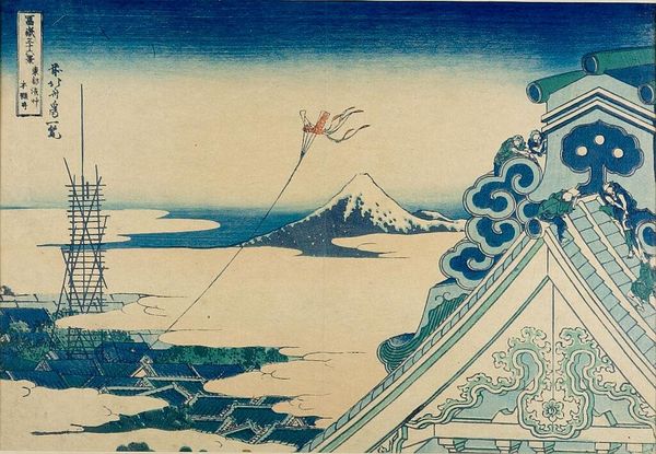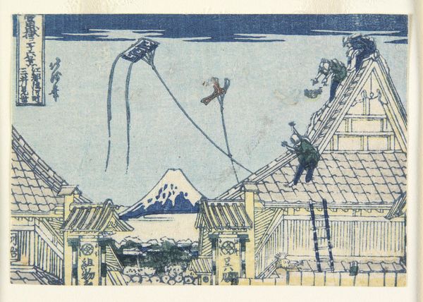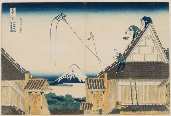 Curator: Hokusai's "Mitsui Shop on Suruga Street in Edo," created around 1831, gives us a peek into urban life in Japan. The work is a woodblock print and a notable example of ukiyo-e, Japanese art. Editor: What a captivating scene! It feels alive with energy. My eye is immediately drawn to the bustling rooftops and that glimpse of serene Mount Fuji in the distance—talk about a contrast. Curator: Indeed. The print offers a fascinating social commentary. It captures the thriving merchant class, symbolized by the Mitsui shop, a powerful business entity in the Edo period. We can analyze it as a piece that blurs lines of urban development and societal norms. Editor: It also says a lot about perspectives, right? The playful chaos on the rooftops, kids flying kites, seems to challenge the serious, money-making world below. There's a whimsical airiness in the high view juxtaposed with grounded details. It reminds me of fleeting, transient thoughts set against a structured existence. Curator: Precisely. Hokusai was very good at employing the visual tensions for political reasons, with undertones often critical to authority. What you call whimsy, some of his contemporaries read it as an implicit suggestion of anarchy. It invited multiple ways to interpret a simple cityscape. Editor: I can almost hear the echoes of bartering, laughter, and those kites soaring in the boundless sky. Looking at how meticulously this was produced using the technique of woodblock printing, one can admire the precision with which each color was laid down to form a cohesive representation, not just an ordinary vista. Curator: His work democratized landscape art, making the imagery accessible to a broader public. It challenged artistic conventions, too. "Mitsui Shop" isn’t simply a landscape or city portrait, it's an investigation into cultural values of the era. Editor: I see what you mean. So much layered within its simplicity. This is more than an old image; it is an immortal exploration into our existence. Curator: I’m glad you pointed out the complexity within the mundane because analyzing social structure by studying everyday scenes continues to add dimensions to art discourse.