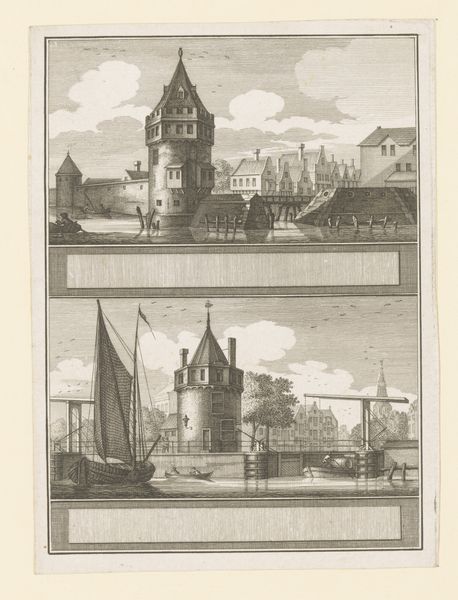 Editor: Here we have “Vier afbeeldingen van het interieur en exterieur van de Zuiderkerk te Amsterdam,” made between 1685 and 1737, credited to Pieter van den Berge. It’s comprised of four images on a single sheet, using print, drawing, paper, ink, and engraving. The meticulous detail is captivating. What draws your attention most when you examine this work? Curator: The insistent linearity. Observe how van den Berge constructs space through precise, unwavering lines. The architectural details are meticulously rendered, prioritizing clarity and geometric form over atmospheric effect. Do you notice the dominance of vertical and horizontal axes? Editor: Yes, the columns especially create that vertical emphasis. And the rows of windows form the horizontal lines. How does this emphasis contribute to the work? Curator: It reinforces the structural integrity of the building, emphasizing its rationality and order. Consider the perspective. It's mathematically sound, yet somewhat rigid. The eye is led inexorably towards the vanishing point, creating a sense of depth, but also constraint. How do you perceive the use of light and shadow? Editor: It’s interesting; the shading is consistent but doesn't feel dramatic. It seems more concerned with defining edges than creating a mood. Curator: Precisely. The even distribution of light, combined with the linear precision, flattens the image, directing the viewer's attention toward its architectural forms rather than any illusionistic depth. Van den Berge prioritized a faithful, almost diagrammatic representation. Editor: So it's less about creating a scene and more about documenting a structure. That emphasis on form definitely changes my perception of it. Curator: Indeed. And, hopefully, deepens your appreciation of its complexities.