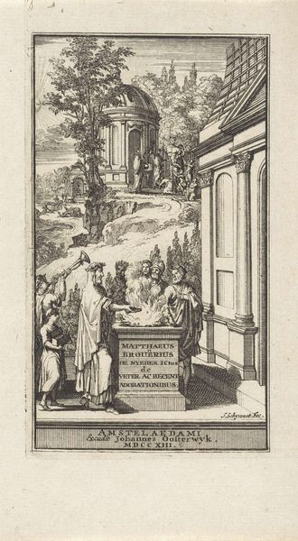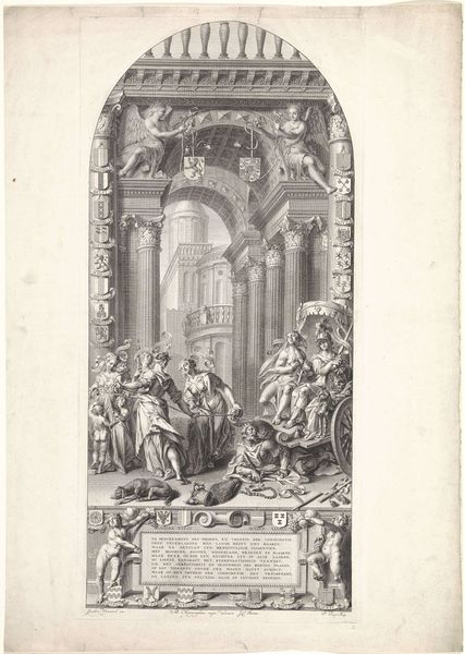 Curator: Let’s explore Lambert Visscher’s title page for the “Monumenta Paderbornensia, 1672.” It's an engraving teeming with classical imagery. Editor: Yes, “Monumenta Paderbornensia, 1672” by Lambert Visscher. It’s executed in metal engraving. At first glance, it's a rather complex composition, with those figures at the bottom. What can you tell me about how its historical context influences its meaning? Curator: Absolutely. This work needs to be seen through the lens of its era, shaped by political, religious and social shifts. Engravings such as these played a crucial role in disseminating knowledge and shaping public opinion in the 17th century. The ruined architecture combined with powerful figures represents the endurance and revival of Paderborn through documentation and its rich, complex history. Note the strong men with flowing water. Any ideas about the significance of the imagery, specifically their placement at the bottom of the page? Editor: Well, given the time period, the reclining figures could symbolize rivers or local springs, like the Pader spring, reinforcing a connection to the land and fertility? Curator: Exactly. And beyond geography, these powerful allegorical figures ground the history detailed in the “Monumenta Paderbornensia.” What do you make of the inscription on the monument? It seems to connect "Roman" and "Franconian" history to "sacred inscriptions". What is the effect of that statement on a 17th century audience? Editor: By linking Roman and Frankish heritage to Paderborn, the title page may be making an argument for the legitimacy and deep historical roots of local customs and governance in the region. Curator: Precisely. And how does understanding its political implications shape our interpretation of this title page and other art of that era? Editor: That context gives me a fuller picture of the function of art back then, it makes me curious about who commissioned this and how these publications may have influenced historical perceptions and local political power. Curator: A superb reflection. By looking beyond just aesthetics, we begin to see art as part of the socio-political ecosystem of its time.
