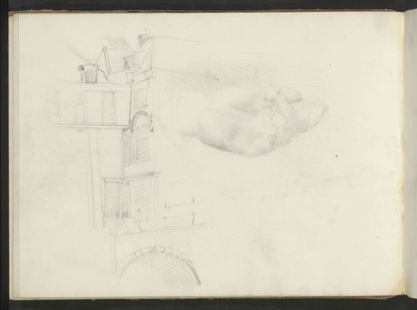 Editor: We're looking at "Molen te Steenbergen," a pencil drawing by Willem Cornelis Rip from around 1896. The sketchiness and limited detail create a slightly haunting effect for me. What catches your eye about its composition? Curator: It is intriguing how Rip orchestrates a structured composition despite its seemingly spontaneous execution. Notice the dynamic interplay between the stark, geometric lines of the mill and the organic, almost gestural, rendering of the surrounding landscape. The artist prioritizes form through the raw materiality of the pencil; tonality indicates form through rough, inconsistent strokes. Editor: It’s interesting you mention the "raw materiality," because it is striking that Rip did not use other artistic resources such as ink or color to supplement and refine his illustration. Curator: Precisely. The intentional use of a single medium, pencil, elevates the reductive nature of the medium; thus, its inherent qualities dictate its essence. Notice how Rip focuses the value around the focal area? Then his line weights become less concentrated as they traverse toward the peripheral of the page. What do you believe Rip wanted to create with this visual effect? Editor: Perhaps it allows our mind's eye to concentrate on the basic structures while letting us interpret what it surrounds by making it up ourselves. Curator: Indeed. A successful application of the relationship between the figure and its negative space. Now, I would argue, through semiotic interpretation, that he seems to want us to examine the concept of shape; but that requires its own unique thesis. Editor: This has given me so much to think about; thank you! I never thought that a simple drawing of a windmill could speak volumes with minimal compositional content. Curator: My pleasure! I concur with you that focusing on the interplay between its basic structures can uncover something profound.