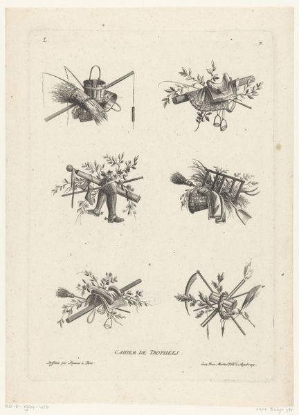 Editor: Here we have "Trophies with Agricultural Attributes", a print made after 1772 and now at the Rijksmuseum. It's really interesting – it feels almost like a wallpaper sample, but each little grouping has this playful combination of farm tools and produce. What do you see in this piece, from your perspective? Curator: Well, looking at this "Cahier de Trophées," or Book of Trophies, from a historical standpoint, it’s interesting to consider the public role of decorative arts in 18th-century Europe. These kinds of prints weren’t necessarily meant to be ‘high art’, but they served an important function in disseminating aesthetic ideals. Notice the recurring motif of agricultural tools. How does this imagery function, considering the socio-political climate? Editor: I see what you mean. Maybe it's a romanticized view of rural life? Showing agriculture as something to be celebrated. Curator: Exactly! This idealized representation aligns with Enlightenment-era ideas about the virtue of labor and a connection to the land, influencing decorative trends in elite households. They’re consuming this image of farming, despite perhaps being far removed from the reality. Consider how the museum itself shapes our perception today; where would these designs be used? Editor: Oh, I see, it would depend where these were placed to start with. Now being shown in the museum adds a different meaning. It makes you think about the patrons and social structures behind artistic choices. I guess I originally saw it as *just* decoration! Curator: Precisely. Seeing these prints prompts a deeper reflection on the relationship between art, society, and power. They demonstrate how aesthetic preferences were influenced by and, in turn, influenced social values and ideals. Editor: That’s a really interesting angle! I hadn't considered how something that looks purely decorative could be so deeply embedded in its time's social values.