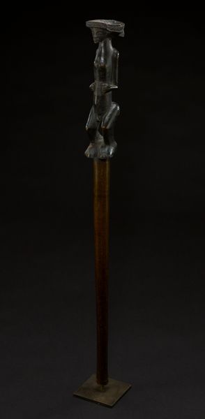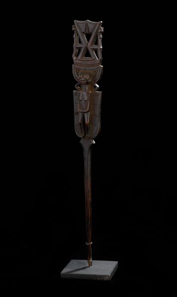 Curator: Immediately, I'm struck by the upward surge of its verticality, a formal expression culminating in that expanded, patterned apex. There's something deeply reverential in this compositional choice. Editor: You’re looking at a Holo-Holo Staff, carved from wood, and it’s believed to date back to between 1875 and 1900. What I find fascinating here is how figuration combines with more abstract forms, as seen in the intricate, repetitive patterns near the top. Curator: Precisely. Those repeated chevrons and linear motifs read almost like a woven textile rendered in wood. There’s an echoing, vibrating sensation embedded into the composition, setting up a rhythm the rest of the work responds to. But tell me, what does it represent? Editor: It is most likely that the Holo-Holo people of the Democratic Republic of Congo used it as an emblem of power and status. The female figure carved at the staff’s center suggests notions of fertility and matrilineal descent. The ancestral mother, perhaps, transmitting authority across generations? Curator: So, a visual link in the chain of being, rendered palpable. Observe the supplicating gesture of the hands of the woman. There's something profoundly earnest and exposed in their presentation. A display of open offering to the one that carries and supports the lineage through time, a beautiful example of human and geometric unity! Editor: What I also note is how the sculpture's formal language doesn’t just embody but enhances that symbolic reading. The simplification of the figure, its elongation— it all reinforces the feeling of upward movement, towards the ancestral or divine realm. The materiality, this particular quality of dark wood, confers the somber and serious aura we pick up on. Curator: It’s a physical manifestation of heritage, memory carved into existence. We’ve looked at its symbolic importance but looking at the craftsmanship we begin to understand a society's relationship to heritage, nature, time, and authority through an intimate symbolic lens. Editor: It seems clear that studying the intersection between form and cultural memory can create endless streams of interpretation for one piece. This staff opens dialogue about much more than just one cultural group; it speaks about power itself.
