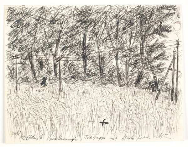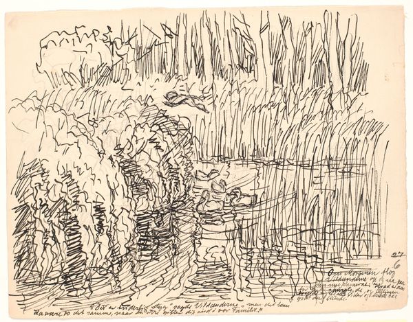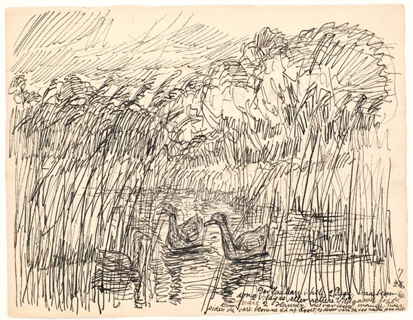 Fritz Syberg made this drawing, "Og i Skovene dybe Søer" with ink on paper. It's all about the process here; you can almost feel Syberg's hand moving across the page, building up the image with layers of quick, scratchy lines. I am fascinated by the materiality of this work. The ink is applied in such a way that it creates a sense of depth and texture, especially in the foreground trees, which feel dense and dark compared to the lighter, more open space of the lake. Look at how the lines in the water aren't just horizontal; they're varied, broken, and kind of messy. It feels like a real, moving body of water. Syberg reminds me of someone like Van Gogh, with that similar need to capture the energy of the natural world through expressive marks. It's a reminder that art is always a conversation, and that there’s no one right way to see or interpret a work of art.