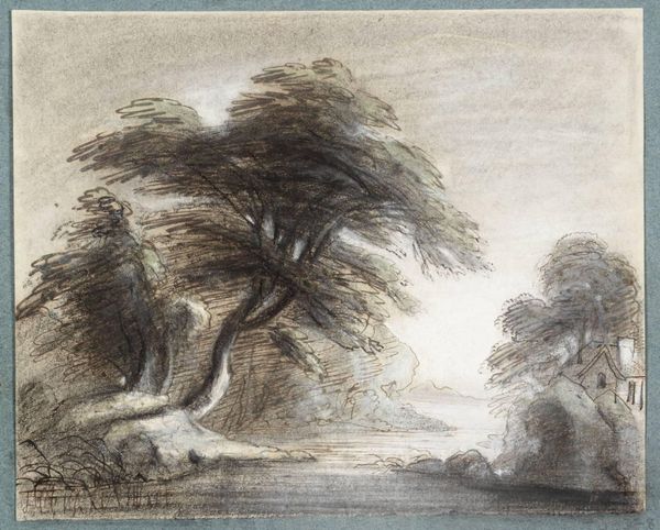 Curator: What a striking, almost monochromatic sketch. It's called Landscape, Cliffs and Trees by Rev. William Gilpin. Editor: The light and shadow certainly create a dramatic effect. The composition feels carefully arranged, almost theatrical. Curator: Gilpin, who lived from 1724 to 1804, was quite influential in the picturesque movement. He thought landscapes should be composed like paintings. Editor: Exactly. Notice how the trees frame the cliffs and water, guiding the eye through the scene. The artist wants us to have a specific, controlled experience. Curator: Indeed. It speaks to an upper class consumption of the landscape, re-packaged for aesthetic pleasure, like a stage set. Editor: Still, regardless of its cultural context, the tonal range is so effective, and it makes for a compelling work, even now. Curator: It's a window into the period's attitude toward nature as art. Editor: A very carefully constructed window.