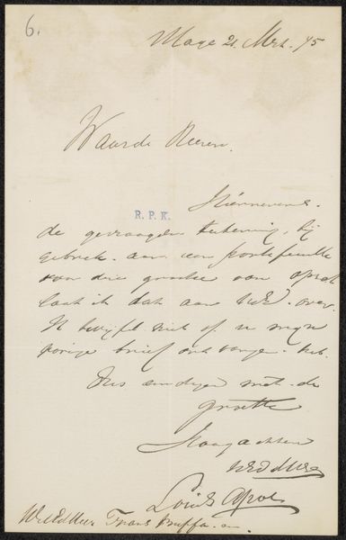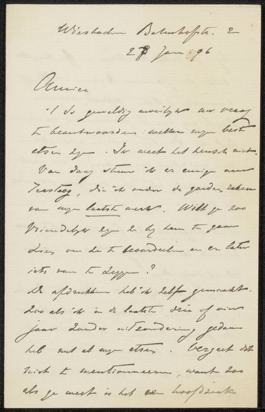 This is a letter to Frans Buffa and Zonen, made by Jozef Israëls, likely in 1885. It’s created with the most basic of materials: paper and ink. The paper’s fibers would have been processed from linen or cotton rags, pulped and pressed into sheets. The ink, likely iron gall, a common choice at the time, would have been mixed from tannin, iron salts, and gum arabic. Notice how the artist’s hand moves across the page, guided by the nib of their pen. The pressure applied determines the thickness of the lines, creating a rhythm and texture unique to the writer. Think about the time and skill involved in handwriting this letter, compared to the ease of modern digital communication. The act of writing itself becomes a form of labor. The letter represents a personal connection, a direct exchange of thoughts and ideas. It's a document of its time, reflecting the social and economic conditions that shaped its creation. By focusing on the materials, the making process, and the historical context, we gain a deeper understanding of the letter's meaning and significance, transcending traditional boundaries between art and craft.