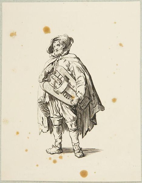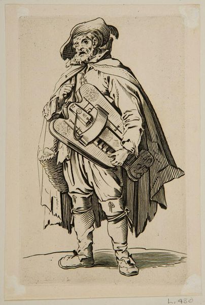Editor: Here we have Jacques Callot's "Hurdy-Gurdy Player," from about 1620. The figure's lined face and tattered clothing are rendered with such detail, it's almost startling. What do you make of Callot's technical skill in this piece? Curator: The etching's success lies in its intricate network of lines. Observe how Callot uses hatching and cross-hatching to create tonal variations, which describe form and texture. The density of lines suggests a keen understanding of light and shadow, no? Editor: Absolutely, the detail on the instrument is remarkable! Did he use a specific technique to achieve this level of precision? Curator: Callot was a master of etching. He refined the échoppe technique, using a needle with an oval section to create swelling and tapering lines. Notice how this lends a calligraphic quality to the print, adding depth and dynamism. Editor: It's fascinating how much detail he achieves with line alone. I'll definitely look more closely at the line work of other etchings now. Curator: Indeed. Close formal analysis reveals the artist's command of the medium, allowing us to appreciate the work on a deeper level.