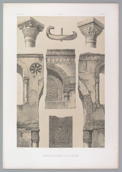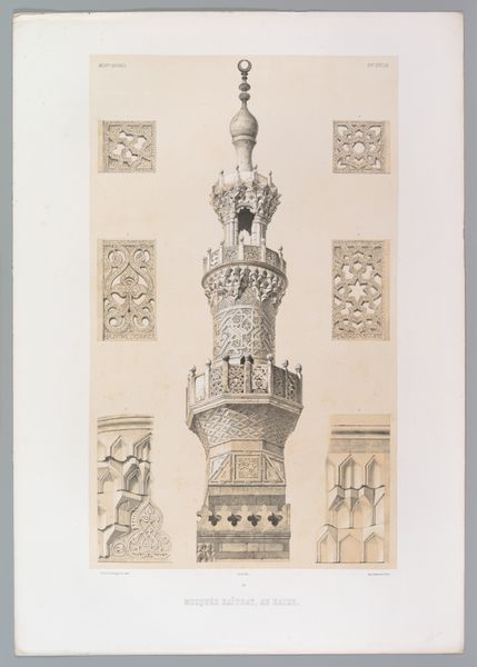 Editor: This print from 1843 captures a minaret of the Mosque of Mohammed el Nâçer in Cairo, by Joseph-Philibert Girault de Prangey. It's strikingly vertical and highlights the texture of the stone. What can you tell me about the composition of this artwork? Curator: Formally, the print demonstrates a rigorous attention to detail and a clear hierarchy in its presentation of architectural forms. The verticality is key. Notice how the artist has segmented the minaret into distinct registers, each defined by varying degrees of ornamentation and geometric complexity. What do you observe about the distribution of light and shadow? Editor: The interplay of light and shadow seems to emphasize the depth of the carvings. It's almost monochromatic but highlights different layers of detail as my eye moves upward. Curator: Precisely. The subtle gradations in tone serve to articulate the architectural mass and the intricacy of the decorative motifs. We can also observe that each section becomes more ornate as it ascends. Note how the balance between the geometric and organic forms create a dynamic visual rhythm. Are there any individual components or particular visual patterns you notice in the print? Editor: The calligraphy band separating the window level from the section above is quite visually arresting. I am fascinated by the top structure; it's intricate! It's as though Girault de Prangey sought to meticulously archive every detail through carefully chosen vantage points and precise etching techniques. Curator: Yes, this speaks to the formal organization. The arrangement of its individual elements and their careful delineation contributes to the overall aesthetic effect of the image. In terms of visual impact, how would you say that this print differs from a mere record or photograph of the same subject? Editor: That’s a fascinating question. Through his compositional choices and tonal range, Girault de Prangey imbues this depiction of a minaret with a striking sense of monumentality, and through sharp outlines he encourages me to explore it architecturally. It makes the actual object feel monumental and significant, which may not come through a photograph in the same way. Curator: A compelling analysis. Considering formal structure and symbolic potential together opens doors to diverse interpretations.