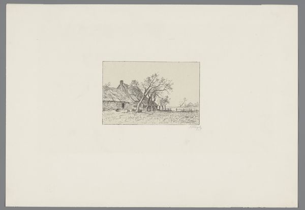 Editor: So, this is *Reiger in een winterlandschap* (Heron in a Winter Landscape) by Lodewijk Schelfhout, created in 1940. It's an etching, so ink on paper. The first thing I notice is how desolate and cold it feels, despite being quite a small print. What do you see in this piece? Curator: That feeling of desolation is key. Think about 1940 – the Netherlands was occupied by Nazi Germany. Landscapes during wartime often become charged with unspoken anxieties. This isn't just a heron in a field; it's a heron in a landscape bearing witness. Editor: Witness to what, exactly? The everyday lives continuing despite the occupation? Curator: Perhaps. The lone heron, a symbol of freedom and wildness, becomes all the more poignant when considered against the backdrop of oppression. How does Schelfhout visually communicate that sense of confinement alongside this animalistic freedom? Editor: Well, the barren trees kind of claw at the sky, and the muted colors create a sense of constraint. Even the small size of the print feels limiting. Curator: Precisely. And consider the Realist style – it's not romanticized or idealized. It’s a stark depiction of the land, mirroring the harsh realities of the time. Do you think choosing such a direct, rather than symbolic style might be making a statement? Editor: Absolutely, the bleak realism feels almost like a quiet act of resistance, documenting the truth when so much else was being controlled. Curator: Exactly. The work allows us to consider landscape art not just as pretty pictures but as historical documents, loaded with meaning and quiet acts of defiance. Editor: I never would have considered how much context changes a simple landscape. Curator: Indeed. By investigating social and political elements, our understanding is considerably deepened.