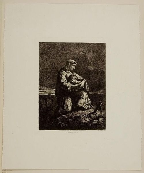 Curator: This piece here is entitled “Marriage of Saint Catherine” by George Jakob Felsing, part of the Harvard Art Museums collection. Editor: It feels incredibly tender, doesn't it? The way the figures are clustered together, almost a single unit. Curator: Yes, the composition is quite intimate. This work would have been consumed within the academic system. Consider how the image normalizes specific gendered ideals for future women. Editor: Right, the soft lines and focus on familial love really drive that home. It’s interesting how the composition guides our gaze to the baby's hand. Curator: A very common feature in similar artworks from the time, designed to further emphasize the sanctity of motherhood and wifely submission to God. Editor: It's a compelling contrast of softness and what I can only assume is a future of religious servitude. Curator: Indeed, it speaks volumes about how art reinforces social norms. Editor: It's a powerful, if somewhat melancholic, depiction to reflect on.
