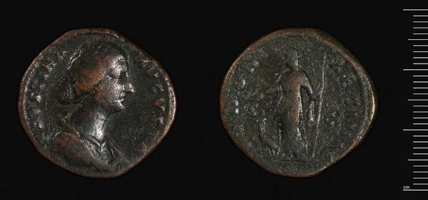 Curator: Before us, we have a Dupondius of Antoninus Pius, a coin currently held in the Harvard Art Museums collection and weighing a mere 11.76 grams. Editor: It's remarkable how such a small object can feel so weighty, so freighted with history and a kind of faded grandeur. Curator: Indeed. The coin's material, likely bronze, and its circular form speak to a calculated design meant for circulation and, of course, the dissemination of power. Look at the crisp lines defining the emperor's profile! Editor: And that profile, perpetually young and noble, served a potent symbolic purpose. It embodies the ideal ruler, projecting stability and authority, almost deity-like in its permanence. Curator: Observe how the deterioration of the metal actually accentuates the relief, giving the emperor’s visage a striking presence. Editor: It reminds us of the transience of power, that even emperors and empires are not immune to the relentless march of time. Intriguing, isn't it? Curator: Absolutely, a powerful demonstration of form and function.