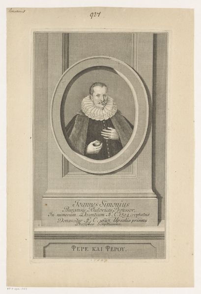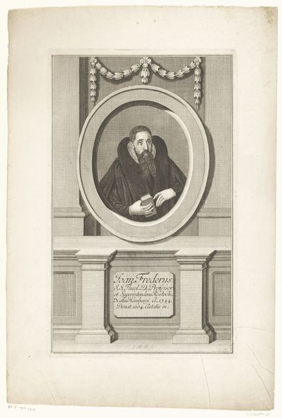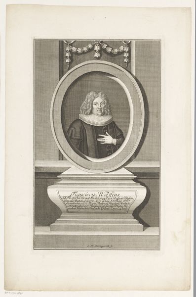 This is Johann Martin Bernigeroth's portrait of Johann Posselius, rendered as an engraving. Posselius lived during a period of immense religious and intellectual transformation in Europe. As a professor of ancient languages, his identity was deeply intertwined with the revival of classical learning that defined the Renaissance and the subsequent intellectual shifts of the Reformation. Notice how Posselius is framed within a circle, set upon a stone pedestal. This artistic choice evokes the classical busts of antiquity, suggesting the importance of his intellectual contributions. He holds a letter, perhaps a symbol of his scholarly correspondence and influence. The details of his garments – the fur-lined coat and elaborate ruff – speak to his status and position within society. Consider how the artistic and social conventions of the time shaped the way individuals were represented, emphasizing their roles and contributions within a structured social hierarchy. This portrait not only immortalizes an individual but also reflects the values and intellectual pursuits of his era.
