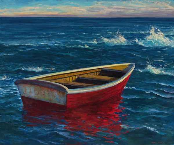 Editor: Here we have "The Fog Warning" by Kehinde Wiley, created in 2017. It looks like an oil on canvas, and what strikes me first is the intensity of the water, those blues and greens. How do you interpret this work? Curator: Structurally, the painting employs a dramatic contrast between the figure and the sea. Notice how the sharp diagonals of the boat and oars cut through the curvilinear waves. This interplay creates a dynamic tension, visually representing the figure's struggle. Editor: Yes, I see what you mean. It's not just the colors but the way the lines pull you in different directions. What do you make of the sky in the background, then? It looks so calm and unbothered by what's happening down below. Curator: Precisely. The muted tones of the sky act as a foil to the vibrant sea. The artist is creating a binary—chaos versus order, the immediate struggle against a distant, indifferent horizon. We can read the brushwork too; see how it becomes more agitated lower in the frame? That physicality reinforces the mood. Editor: That's fascinating! So, it's not just what's depicted, but how it's depicted, through brushstrokes, composition. Curator: Exactly. It's through the manipulation of these formal elements—line, color, texture—that Wiley constructs the painting's meaning, drawing our attention to not just the subject, but the artist's own hand. It makes the process as important as the narrative. Editor: I hadn't thought of it that way before, of analyzing the purely visual. Thanks for expanding my understanding of what a painting can communicate. Curator: Indeed. Attending to the structure reveals deeper layers than are available at first glance. I, too, will carry that new view into my daily analyses.