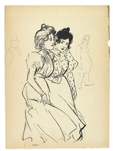 Editor: Here we have Randolph Caldecott's "The Three Customers," a drawing made with pen, ink, and gouache on paper. I am struck by its seemingly effortless depiction of a bustling cityscape. What do you see in this piece? Curator: I am particularly interested in the economy of line and the artist’s engagement with positive and negative space to define form. Notice how the relative simplicity of the dresses contrasts with the textured hatching that brings to life the city in the background. How do these stylistic differences inform your perception? Editor: I suppose the flat rendering of the women focuses my attention on them as subjects, making the busy background a secondary element of context, almost like a stage. What I find intriguing is that the line weights used seem identical to render the figures as well as the background details. What is your take? Curator: Precisely! That interplay creates a compositional tension. Caldecott directs our gaze using line, but then deliberately subverts expectations by denying the distinction you would find with, say, atmospheric perspective or chiaroscuro modeling. This results in a flattening of space that draws the eye toward the overall pattern. Editor: I hadn't considered that flattening effect! Looking at the artwork with the intention of spotting formal connections really brings out its design elements. Curator: Indeed. Approaching it formally enables a deeper appreciation of the structural relationship within Caldecott's piece and sheds light on his intentions.