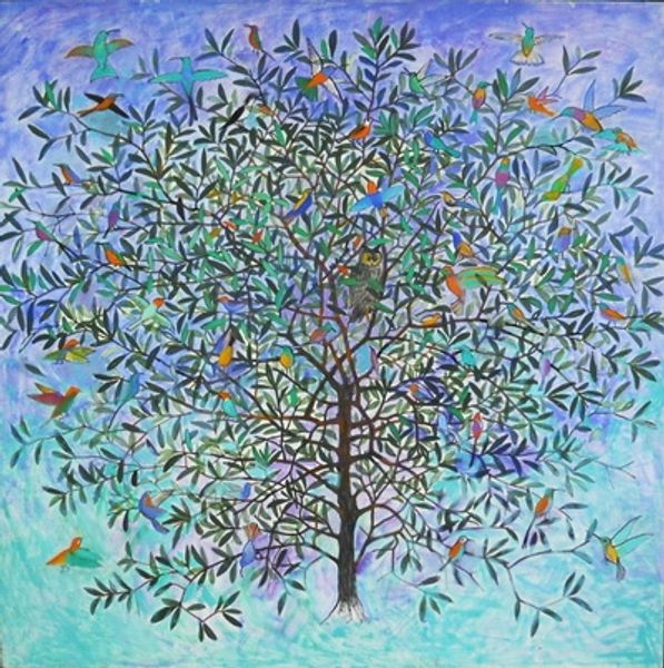 Billy Childish painted Reunion Owl, we don’t know exactly when, using oils on canvas. Isn't it amazing how brushstrokes alone can convey so much? This painting has a raw, immediate feel, as if Childish was wrestling with the image, not just recording it. The surface is alive with marks – see how the paint is laid on thick, almost sculptural in places, especially around the owl's piercing yellow eyes. Then look at the background, the way he uses blues, pinks, and whites to suggest depth without actually describing it. There's a beautiful awkwardness to this piece, a sort of anti-perfection that reminds me a bit of early Guston, like he's reminding us that painting is a conversation, a back-and-forth between the artist and the canvas. Ultimately, it embraces the messy, unresolved nature of life itself.