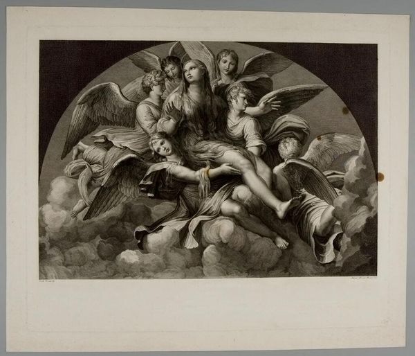 Editor: Jean Jules Jacott’s “Pride” presents a dramatic scene of figures caught in a storm, currently residing at the Harvard Art Museums. The central figure seems to defy the elements, arms raised in what could be defiance or agony. What historical context might illuminate this intense imagery? Curator: Given the title, "Pride," and the melodramatic, almost theatrical composition, I see echoes of Romanticism's fascination with the sublime and the individual against overwhelming forces. How might societal views on morality or hubris at the time influence its reception? Editor: So, viewers might have seen this as a commentary on the dangers of excessive self-regard, a cautionary tale perhaps? Curator: Precisely. It invites us to consider the public role of art, how artists used imagery to engage with contemporary moral and philosophical debates, influencing public perception through dramatic visual narratives. Editor: That’s fascinating. I never considered how directly art could participate in shaping societal values. Curator: Indeed, and thinking about the politics of imagery helps us see how museums contribute to constructing our understanding of the past.