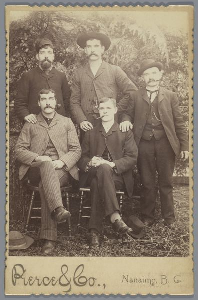 Editor: Here we have a photograph titled "Group of men including Joseph Cheetham (left front) with tennis racket, cricket bat and hunting rifles in Russia," dating from 1903-1904. It's currently housed in the Rijksmuseum. What strikes me is the rather staged composition and the odd juxtaposition of sporting equipment and hunting rifles. What do you see in this piece? Curator: Primarily, I observe a deliberate arrangement of forms. Consider the disposition of the figures: the seated men create a grounding horizontal, against which the standing figures impose a vertical rhythm. The textures, too, are quite varied given it's a single-tone photograph: note the smooth wood of the sports equipment contrasting with the rough texture of the tweed suits. Editor: That's a great point about the textures. It does seem that the photographer was aiming for a carefully constructed image rather than a candid shot. Why do you think the objects included contribute to our understanding of the subjects portrayed? Curator: The objects serve as signifiers of status and leisure. Observe how the cricket bat, tennis racket, and hunting rifles each communicate a specific activity. Furthermore, the textural differences serve to create a dialogue among the figures. Consider, for instance, how the eye travels between the man with the tennis racket and the ones holding rifles: can this movement reveal some correlation? Editor: That is really interesting. I hadn’t considered how the textures work to unite different individuals within the composition, highlighting their activities as status symbols. Thanks! Curator: Indeed. It's in the articulation of these elements—texture, line, form—that we decode the work's visual logic.