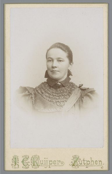 This portrait of a young woman was made by Arnold Nelius Marinus Johannes Fock using photographic techniques of the time. The subtle sepia tones and soft focus are a direct result of the light-sensitive chemistry used to fix the image onto the paper. Photography in the 19th century was a laborious process, involving meticulous preparation of plates and careful control of light and development. This wasn't just about pointing and shooting. It was a craft, demanding both technical skill and an artistic eye to capture the essence of the subject. Looking at the photograph now, we can appreciate the skill involved in creating this lasting memento. This highlights photography's role in democratizing portraiture, making it accessible to a broader section of society, not just the wealthy. The image becomes more than just a picture; it's a record of technological and social change.