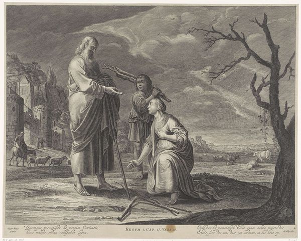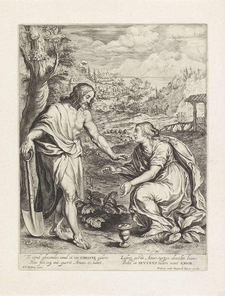 Editor: We're looking at "Christ Appears to Mary Magdalene as a Gardener," an engraving from 1673 by Adriaen Lommelin, held at the Rijksmuseum. It’s such a detailed image, almost photographic in its rendering of textures. I'm struck by how serene and almost…domestic, this scene feels despite the obvious religious significance. How do you interpret this work? Curator: It’s fascinating, isn’t it? Here we see Christ presented with a gardening tool, and Mary Magdalene reaching towards him – a beautiful visual representation of transformation and recognition. But let's consider the deeper symbolism. What does a garden signify? Editor: Growth? New beginnings, maybe? I see the chalice too; it looks very precious compared to the earthly setting. Curator: Precisely. Gardens are traditionally seen as earthly paradises, spaces of renewal, recalling Eden and alluding to a return to a state of grace. Christ’s guise as a gardener suggests that he is nurturing faith and new life. The chalice points to Mary Magdalene’s role and relationship to Jesus. Consider the phrase etched: "Noli me tangere". Why this warning? Editor: Oh! I read that it means, "Touch me not." I guess it speaks to the sacred nature of the resurrected Christ, maybe hinting at his ascension. Curator: Exactly! He's both present and transcendent. The whole image really captures a pivotal moment of doubt and recognition and connects it to potent symbols of spiritual rebirth. See also how he shields the wounds to the torso. He doesn't yet invite observation, not until the ascent to the father. The symbols within the image speak across time. Editor: I hadn't thought of it that way! The visual layering of earthly labor, resurrection, and divinity makes this a very rich piece. I now notice continuity between Eden, the present scene, and even paradise beyond this world. Thanks for pointing out those details!