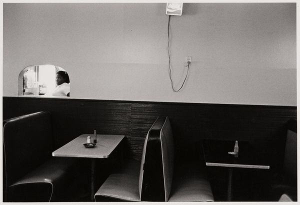 Curator: Robert Frank's "Coffee shop--Casper, Wyoming" made in 1956, offers a glimpse into a seemingly ordinary American scene. It’s a gelatin silver print. Editor: The atmosphere immediately strikes me. There's this overwhelming feeling of isolation despite the diner setting. The stark blacks and grays deepen the melancholy. Curator: Frank's photographs often portray a sense of alienation, challenging the idealized post-war narrative. We see the iconic diner stools receding into darkness. It’s very Ashcan School, finding beauty or at least significance, in everyday urban grit. Do you feel a symbolic weight in this framing? Editor: Absolutely. The empty stools and the lone figure hunched over in the booth symbolize a deeper sense of disconnection, particularly when read in the context of Frank's broader project, "The Americans." This wasn't the picture postcard vision. Consider that during this time there was pressure to fit in, to present a homogenous ideal, and Frank presents this alternative viewpoint of not everyone feeling they belonged to this image. Curator: There's a stark realism, absent any artificial drama or heightened emotion. That one figure in the corner becomes monumental. His stance is universal and recalls centuries of paintings that involve isolated suffering and internal contemplation. What of that specific figure's placement and meaning within the frame? Editor: It reads like a critique of American society and the myth of the "American Dream" - the undercurrent of anxiety that shadows these people. The diner, usually a social hub, becomes a place of solitary reflection. This picture freezes a fleeting moment of this disquiet. Frank offers the viewers a truth that may be harsh and less optimistic, but ultimately more real. Curator: Frank has a potent way of presenting simple settings. You’ve really expanded my thinking around the psychological context here. It definitely is heavy with the past even though it represents this diner. Editor: It seems Frank uses his camera almost as a sociological tool. I mean, what is more psychologically potent than that one figure almost dissolving into shadows in the booth in the background?